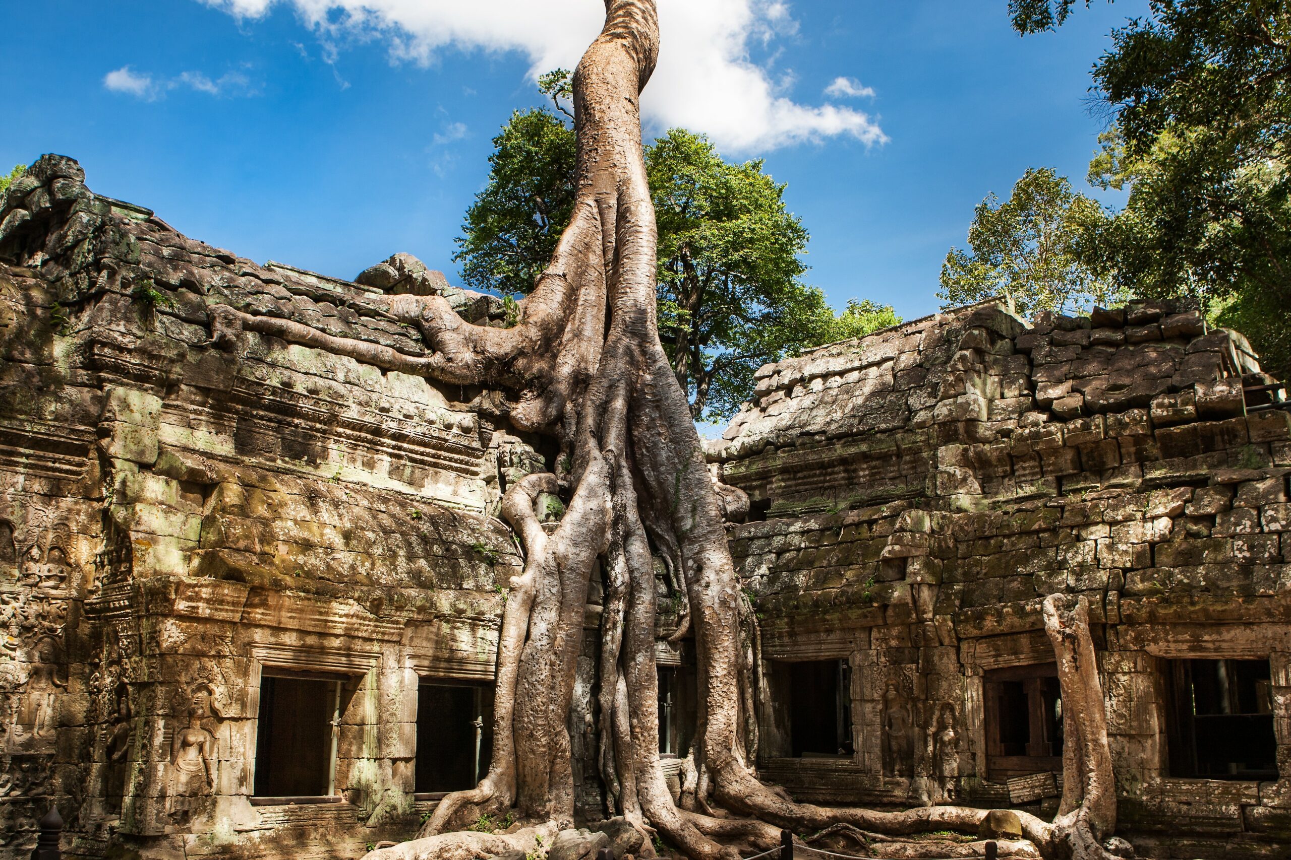 You will spend the entire day sightseeing in Siem Reap. First, you will travel to the world-famous former royal city of Angkor Thom with its famous gates. You will visit, among other things, the royal temple of Phimeanakas, the Elephant Terrace and the Terrace of the Lion King, the Bayon Temple, and the famous Ta Phrom Temple, which was once a monastery and whose walls are partially overgrown by gigantic jungle trees.